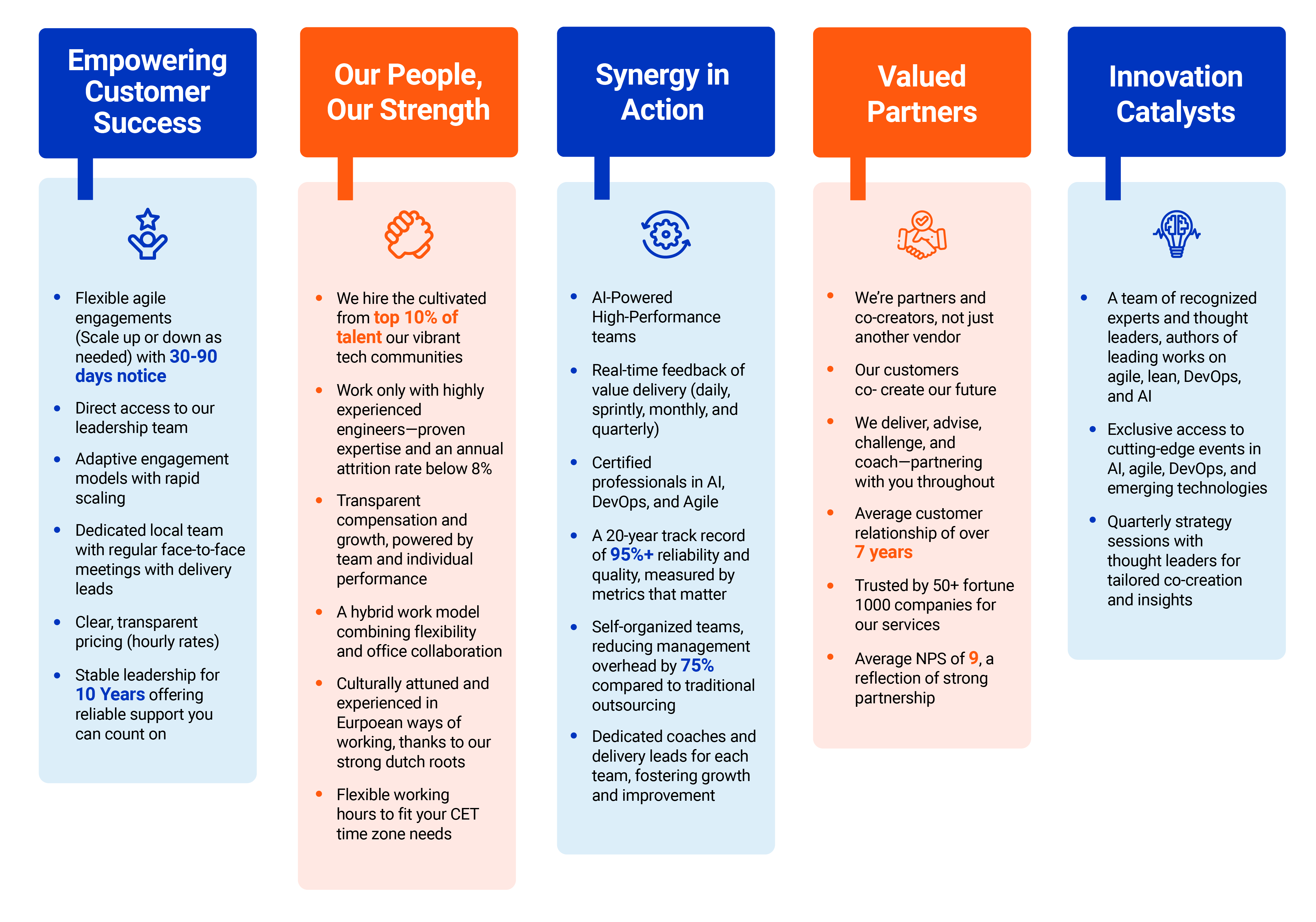 Experience the collaborative environment at our UK, Netherlands, India development centers. A strong European culture with a lean hierarchy empowers us to work together as co-creators, development partners, and growth catalysts, making you an integral part of our team.